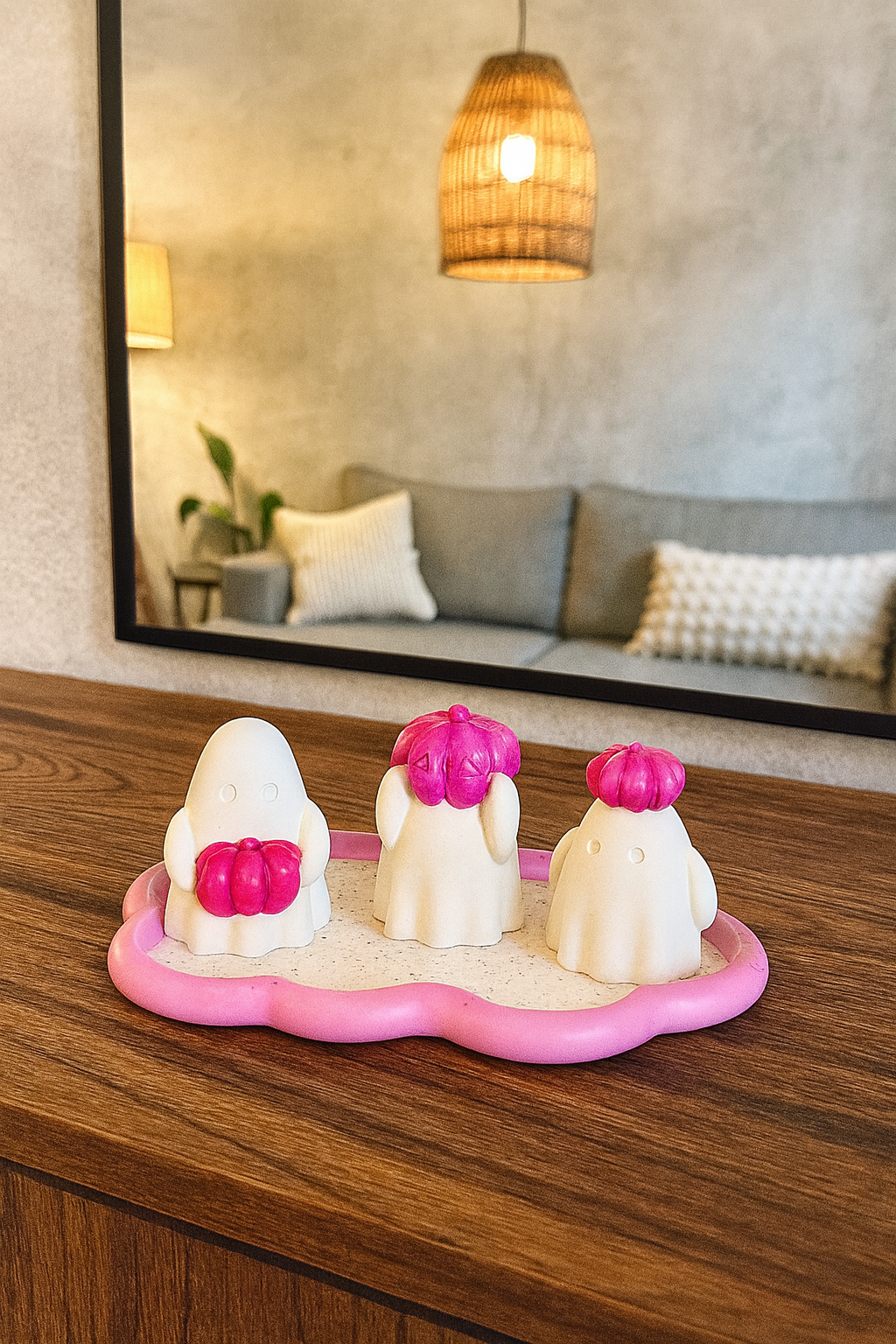 Made from eco-friendly jesmonite, these ornaments have a smooth, stone-like finish and are perfect for adding a playful Halloween accent to shelves, mantels, or table displays. Each piece is unique thanks to the handmade process, making them extra special.